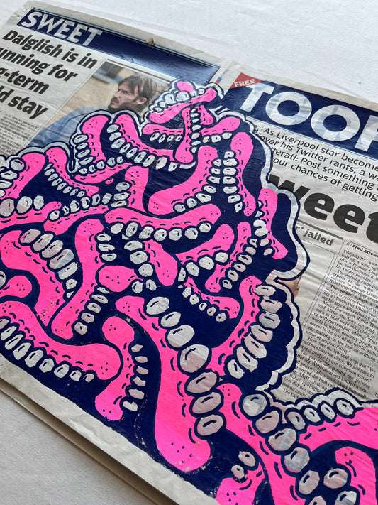 Sweet Toof’s work starts with and evolves out of his street art, whether as a solo graffiti artist or in collaboration with others. Like the streets of 1980s New York, Britain’s streets today are being reclaimed by an ever-increasing army of street artists of which Sweet Toof is one of the most prolific and artful. Typical tags, throw-ups, and more elaborate street pieces become a whole language that informs his studio works.