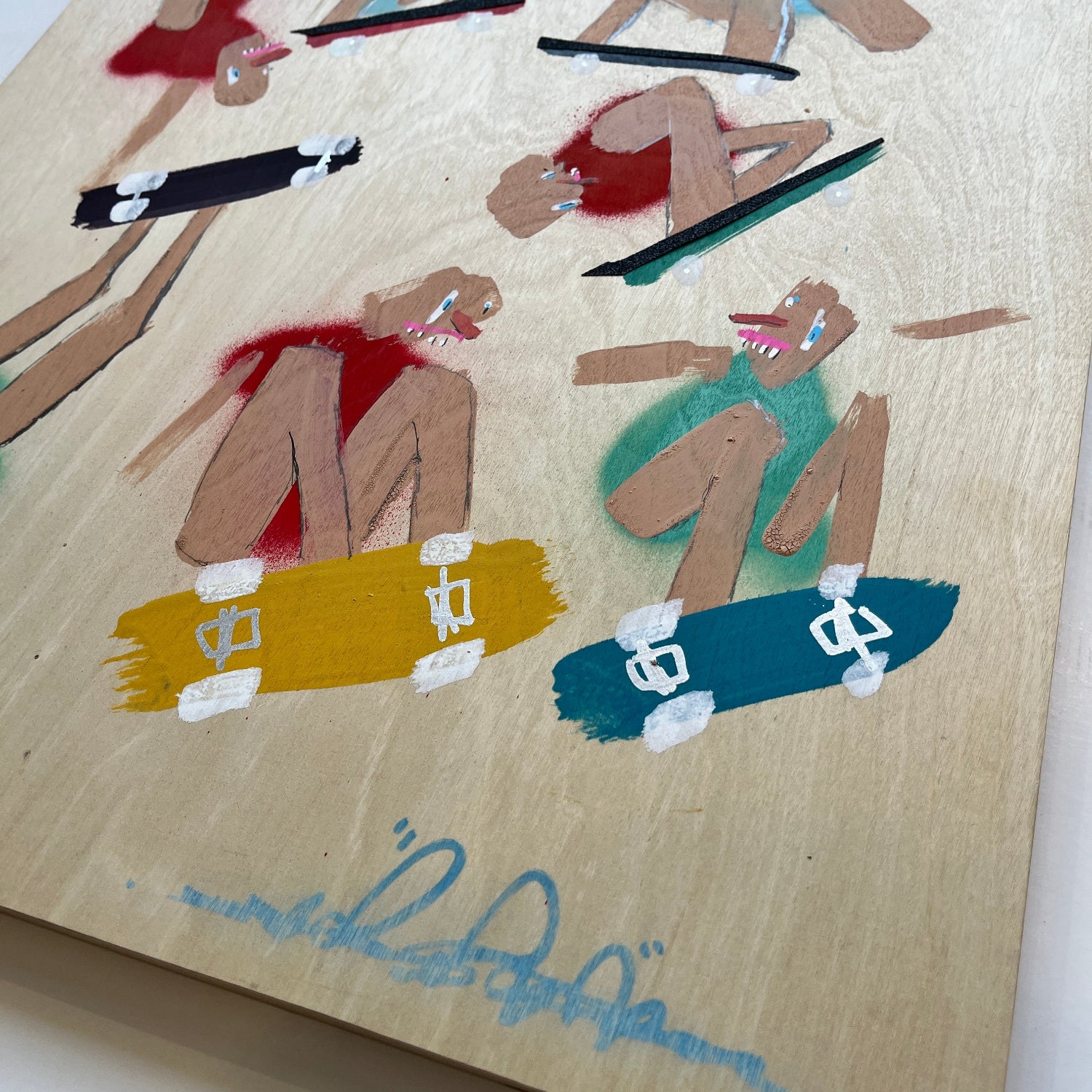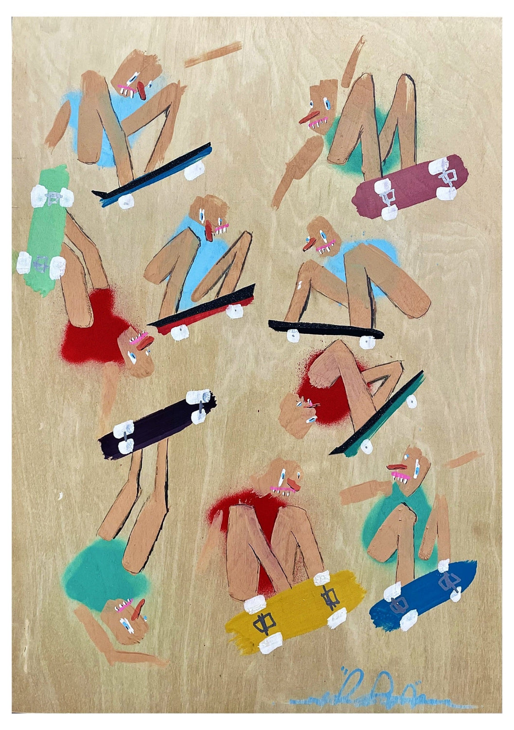 Spray paint, acrylic, paint pen and skateboard grip tape!