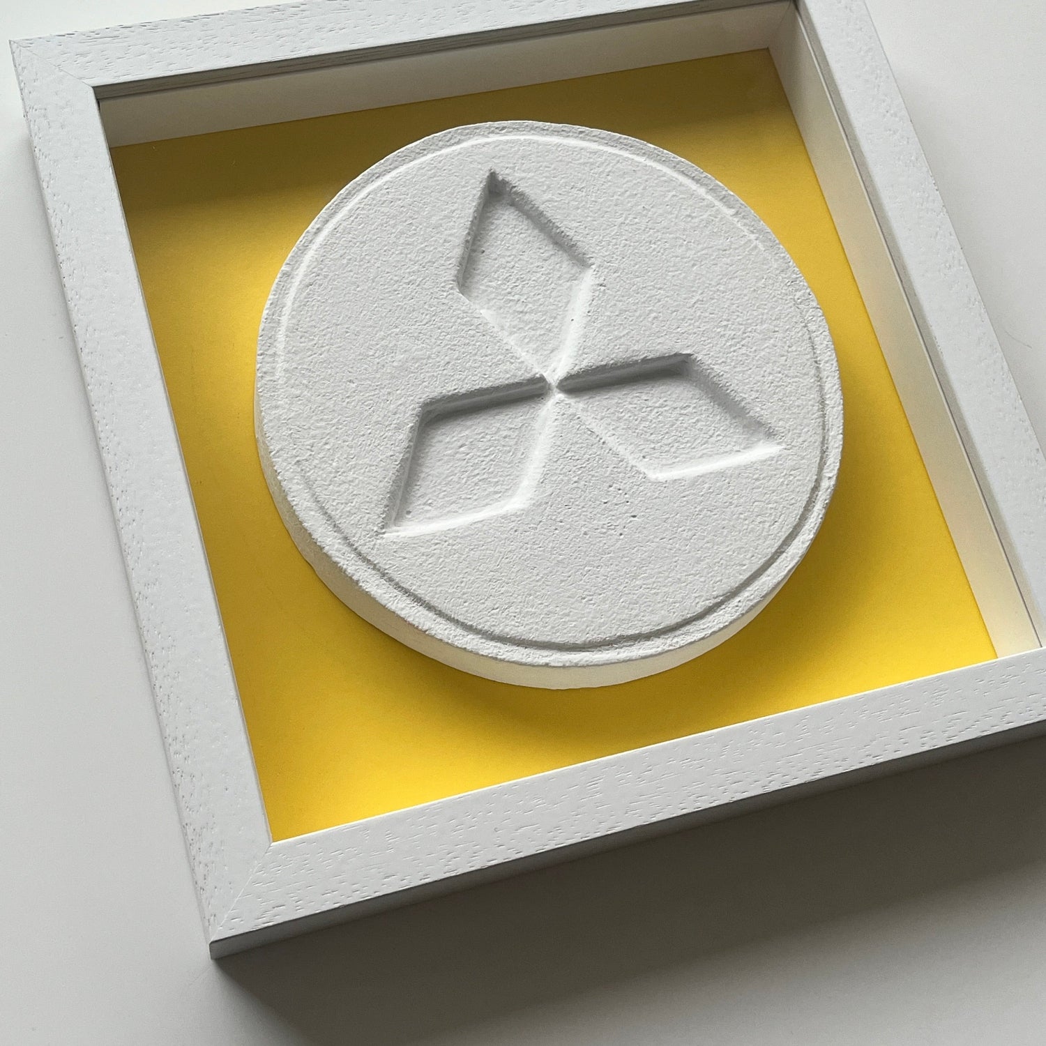 A large pill, hand-moulded in plaster, painted and custom framed with non-reflective glass.