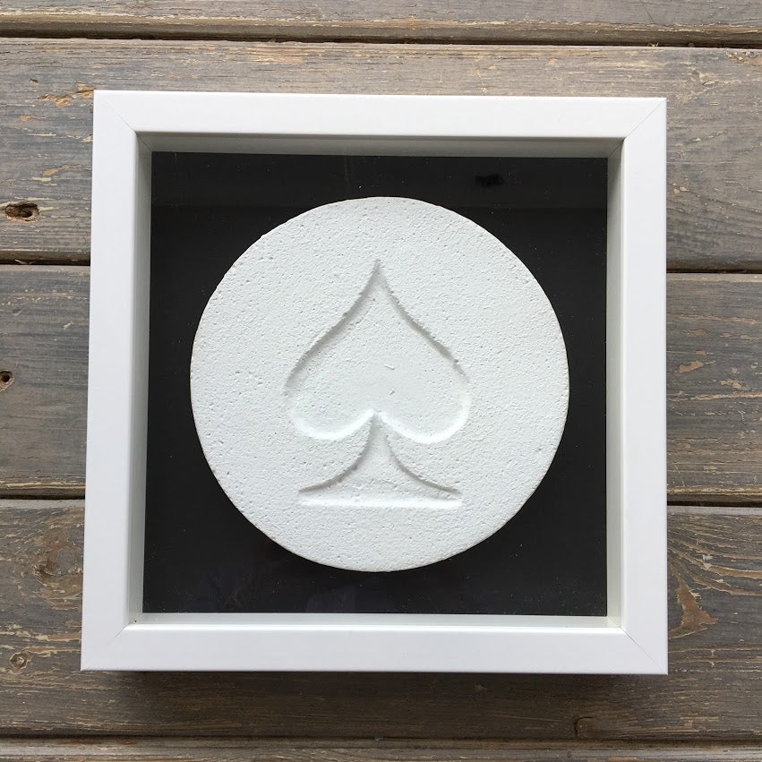 A large pill, hand-moulded in plaster, painted and custom framed.