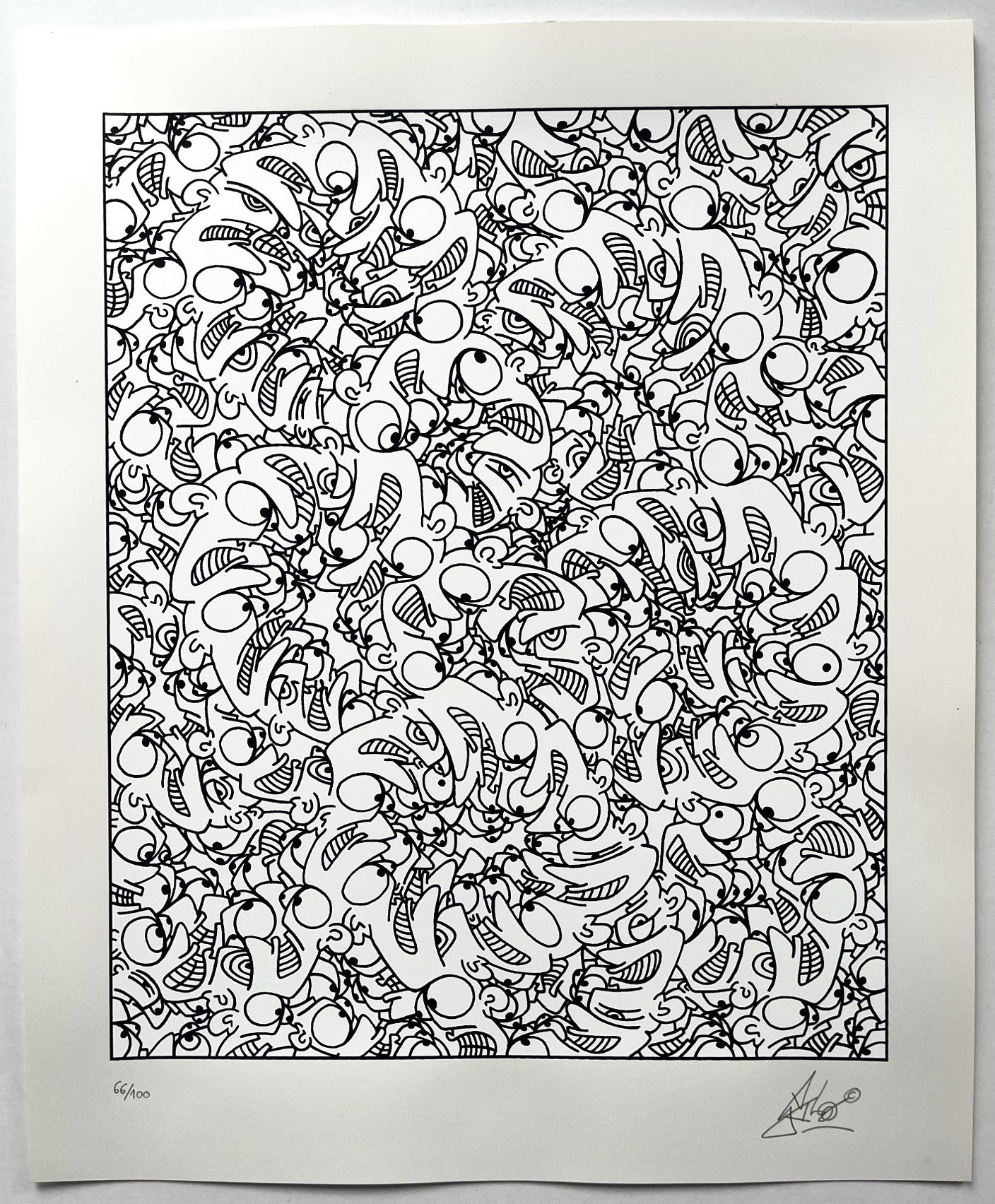 Galo's first screenprint consists of dozens of his 'creators' in a chaotic jumble of confusion and angst. Beautifully printed in thick black, blue, red or green & white ink on 300gsm Arches 88 paper.