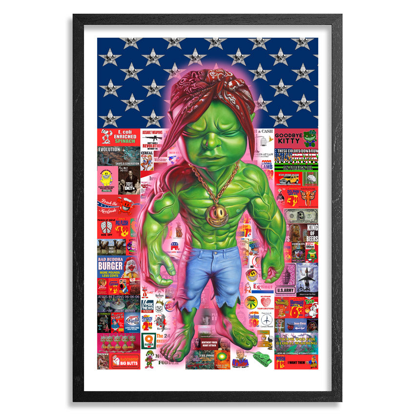 "Temper Tot is the immature angry id of America. In this incarnation Temper Tot dons the iconic headscarf of pop culture martyr Tupac Shakur, turning the hip hop star into another brick in the seamless wall of advertising ballyhoo that is the both surface and substance of our culture, a place where everything is either a commodity or an ad for something else, or both." - Ron English